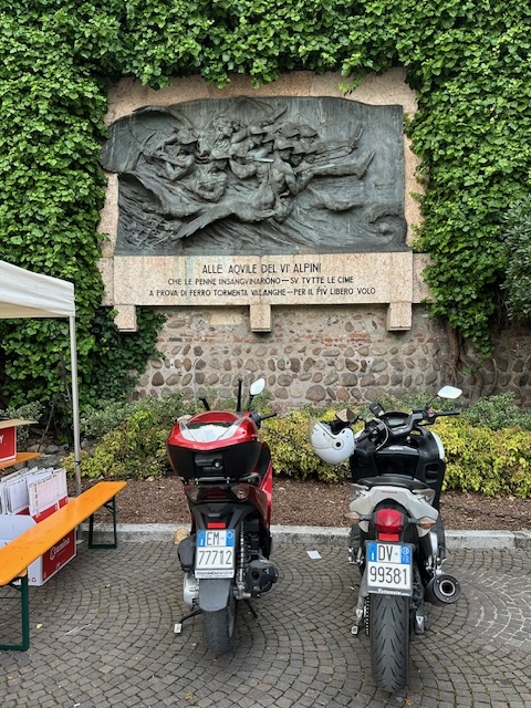 石壁に埋め込まれた大きなブロンズレリーフと、イタリア語の碑文が特徴の女性の自由と正義への貢献を讃えるモニュメントです。